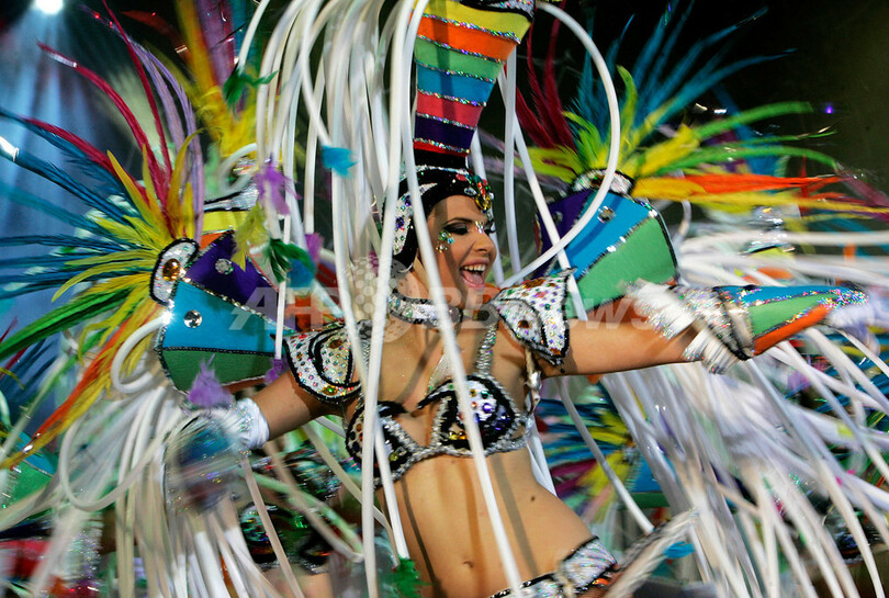 スペイン・カナリア(Canary)諸島テネリフェ(Tenerife)島で、サンタクルス・デ・テネリフェ(Santa Cruz de Tenerife)のカーニバルに参加したダンサー(2009年2月14日撮影)。(c)AFP/Desiree Martin
