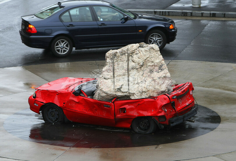 【2月17日 AFP】10日、オーストラリア・シドニー港(Sydney Harbour)のウォルシュ・ベイ(Walsh Bay)近くのロータリーに展示されている、巨大な岩が車を上から押しつぶしている珍しいオブジェ。