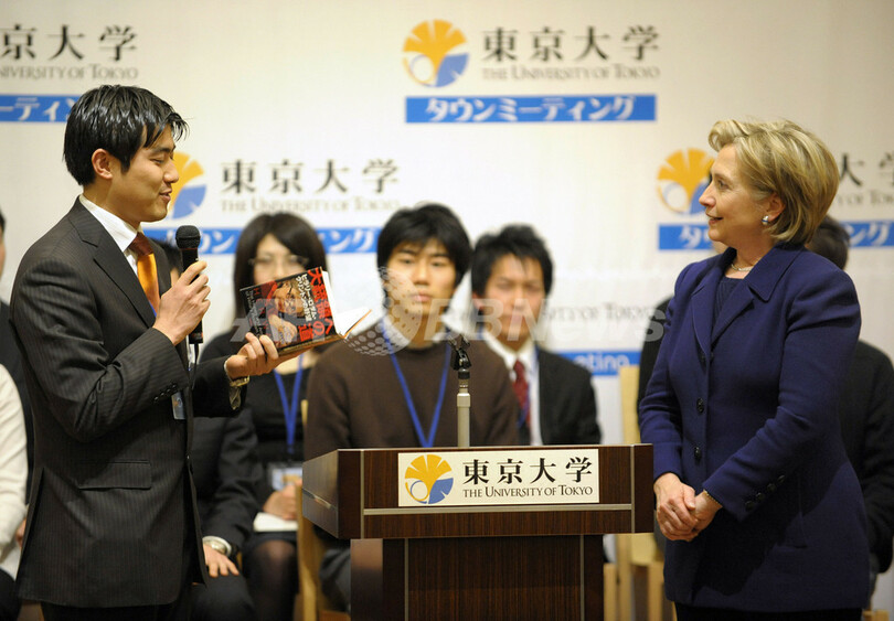 クリントン長官は麻生首相、小沢代表とのそれぞれの会談に先立ち、東京大学を訪れ、学生数百人とともにタウンミーティングを行い、気候変動やクリーンエネルギーなどのテーマについて討論した。(c)AFP/Lachlan Carmichael