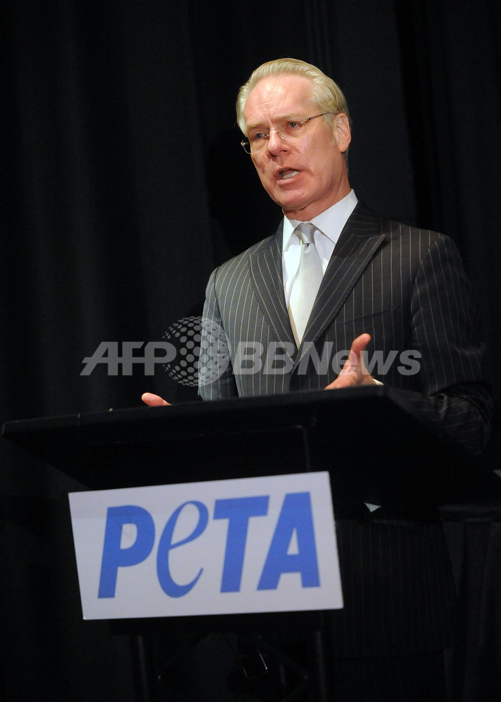 ファッション商品として使われるファーやウール、レザーがいかに動物に危害を加えているかを訴え、消費者に選択を問う内容となっている。ナレーターは、TV番組「プロジェクト・ランウェイ(Project Runway)」にも出演するティム・ガン(Tim Gunn)が担当した。(c)AFP/Getty Images