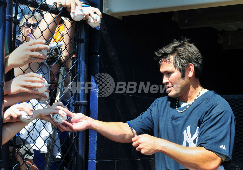 米大リーグ(MLB)、ニューヨーク・ヤンキース(%%New York Yankees%%)は18日、野手陣がフロリダ州タンパのジョージ・M・スタインブレナー(George M. Steinbrenner Field)で行われているキャンプに合流し練習を開始した。写真はファンへのサインに応じるジョニー・デーモン(%%Johnny Damon%%)。(c)AFP/Getty Images/Al Messerschmidt