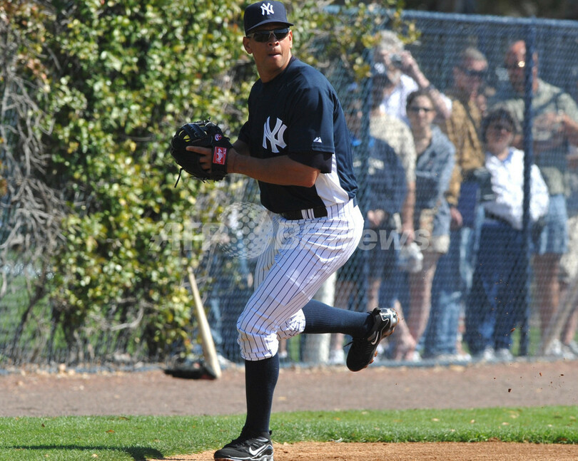 米大リーグ(MLB)、ニューヨーク・ヤンキース(%%New York Yankees%%)は18日、野手陣がフロリダ州タンパのジョージ・M・スタインブレナー(George M. Steinbrenner Field)で行われているキャンプに合流し練習を開始した。写真は守備練習に臨むアレックス・ロドリゲス(%%Alex Rodriguez%%)。(c)AFP/Getty Images/Al Messerschmidt