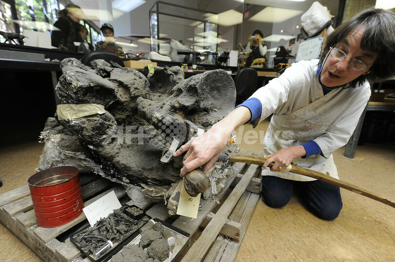 この化石は、2年前に地下駐車場工事の際に発掘されたものの一部で、ほかに木の幹やカメ、カタツムリ、魚介類などの化石や最終氷河期の樫の葉などが見つかった。(c)AFP