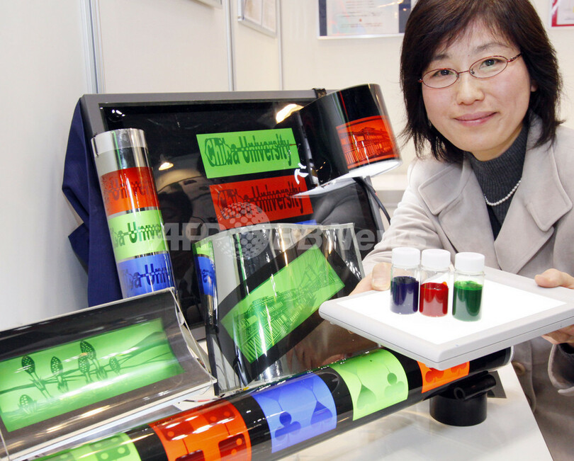 【2月21日 AFP】東京で18日から20日まで開催された国際ナノテクノロジー総合展・技術会議(nano tech 2009 International Nanotechnology Exhibition & Conference)で展示された曲げられる液晶ディスプレイ(LCD)。千葉大学(Chiba University)の小関健一(Kenichi Koseki)准教授が開発した液晶を封じ込めたカプセルを含むインクを透明導電性膜に印刷してあり、曲げることができる。(c)AFP