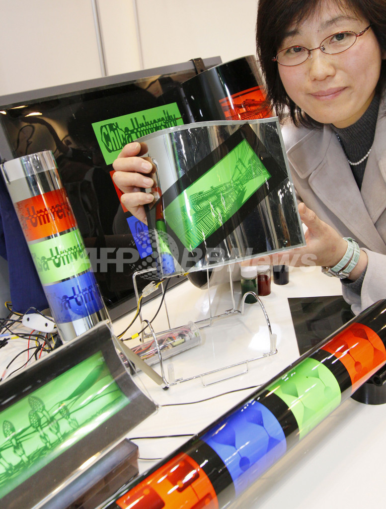 【2月21日 AFP】東京で18日から20日まで開催された国際ナノテクノロジー総合展・技術会議(nano tech 2009 International Nanotechnology Exhibition & Conference)で展示された曲げられる液晶ディスプレイ(LCD)。千葉大学(Chiba University)の小関健一(Kenichi Koseki)准教授が開発した液晶を封じ込めたカプセルを含むインクを透明導電性膜に印刷してあり、曲げることができる。(c)AFP