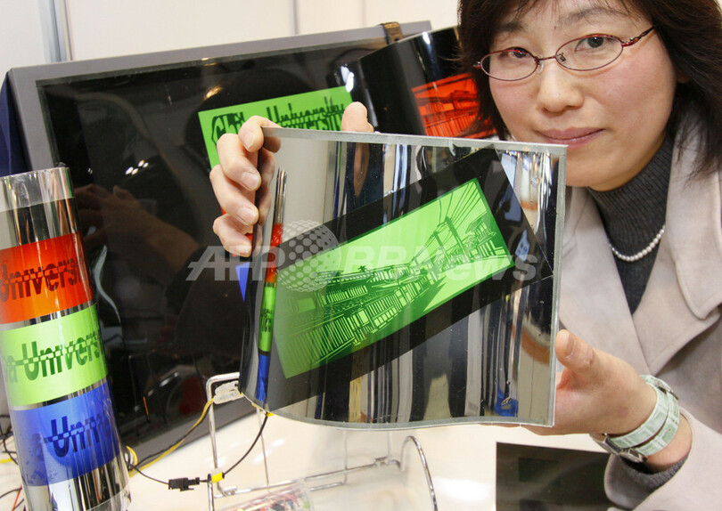 【2月21日 AFP】東京で18日から20日まで開催された国際ナノテクノロジー総合展・技術会議(nano tech 2009 International Nanotechnology Exhibition & Conference)で展示された曲げられる液晶ディスプレイ(LCD)。千葉大学(Chiba University)の小関健一(Kenichi Koseki)准教授が開発した液晶を封じ込めたカプセルを含むインクを透明導電性膜に印刷してあり、曲げることができる。(c)AFP
