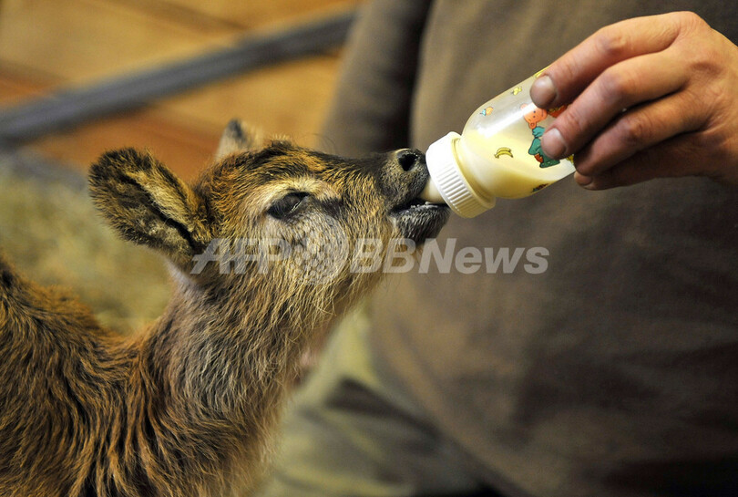 【2月21日 AFP】ハンガリーのブダペスト動植物園(Budapest Zoo Park and Botanic Garden)で飼育係の持つ哺乳瓶を吸う生後3日目のウシ科のナイルリーチュエ(Nile Lechwe)の赤ちゃん。ギズモ(Gizmo)と名付けられた。