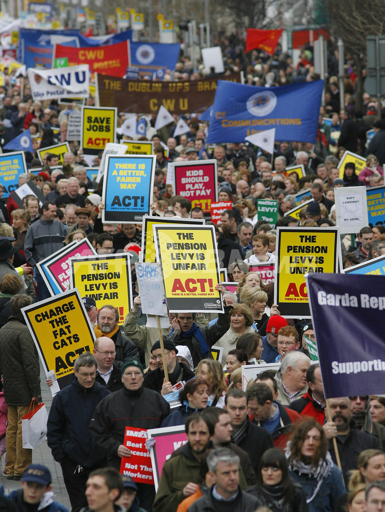 ニュース 政治・経済 アイルランドで大規模な抗議集会、年金保険料値上げなどに抗議 2009年2月22日 12:18 発信地:ダブリン/アイルランド [ ヨーロッパ アイルランド ] このニュースをシェア ‹ › ❮ 5/5 ❯ アイルランドのダブリン(Dublin)で行われた政府に抗議する集会のパレード(2009年2月21日撮影)。(c)AFP/Peter MUHLY 画像作成中 ! 【2月22日 AFP】アイルランドのダブリン(Dublin)中心部で21日、政府に対する大規模な抗議行動が行われた。 警察発表によれば参加者は12万人に上った可能性もある。主に政府が打ち出した35万人の公務員を対象にした年金保険料の値上げに反対の声を上げた。 同国の公共セクター最大の労組IMPACTによれば、中低所得世帯で1年に1500-2800ユーロ(約18万-34万円)の負担増になるという。 政治・経済 一覧へ> メディア・報道関係・法人の方向け 写真・動画 購入のお問合せ>