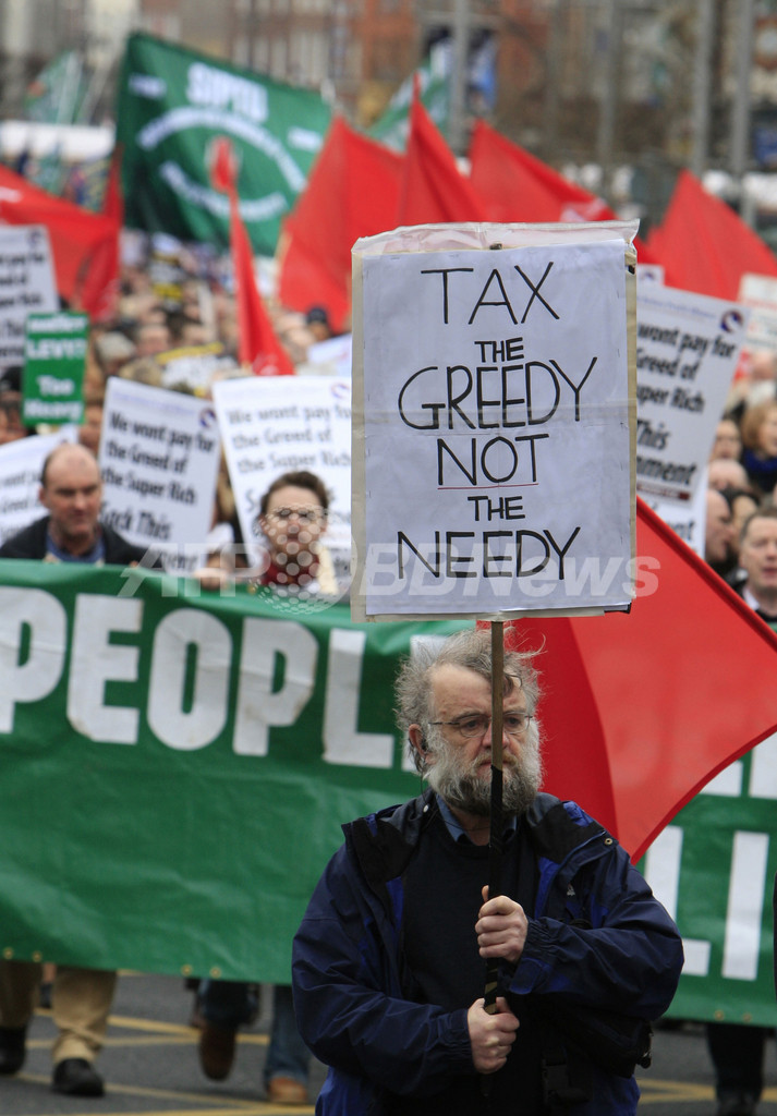 ニュース 政治・経済 アイルランドで大規模な抗議集会、年金保険料値上げなどに抗議 2009年2月22日 12:18 発信地:ダブリン/アイルランド [ ヨーロッパ アイルランド ] このニュースをシェア ‹ › ❮ 4/5 ❯ アイルランドのダブリン(Dublin)で行われた政府に抗議する集会のパレードでプラカードを掲げて歩く男性(2009年2月21日撮影)。(c)AFP/Peter MUHLY 画像作成中 ! 【2月22日 AFP】アイルランドのダブリン(Dublin)中心部で21日、政府に対する大規模な抗議行動が行われた。 警察発表によれば参加者は12万人に上った可能性もある。主に政府が打ち出した35万人の公務員を対象にした年金保険料の値上げに反対の声を上げた。 同国の公共セクター最大の労組IMPACTによれば、中低所得世帯で1年に1500-2800ユーロ(約18万-34万円)の負担増になるという。 政治・経済 一覧へ> メディア・報道関係・法人の方向け 写真・動画 購入のお問合せ>