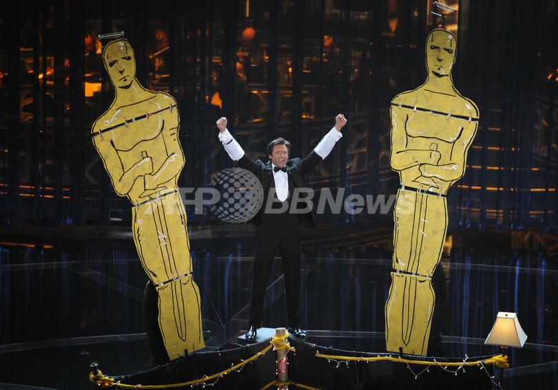第81回アカデミー賞(Academy Awards)授賞式が22日、米ロサンゼルス(Los Angeles)のコダック・シアター(Kodak Theatre)で開催され、ステージに多くのスターが登場した。写真は、司会を務めた俳優ヒュー・ジャックマン(Hugh Jackman、2009年2月22日撮影)。(c)AFP/Gabriel BOUYS