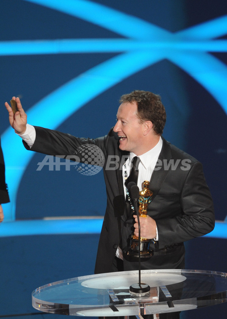 第81回アカデミー賞(Academy Awards)授賞式が22日、米ロサンゼルス(Los Angeles)のコダック・シアター(Kodak Theatre)で開催され、ステージに多くのスターが登場した。写真は、映画『スラムドッグ$ミリオネア(Slumdog Millionaire)』で脚色賞を受賞したサイモン・ビューフォイ(Simon Beaufoy、2009年2月22日撮影)。(c)AFP/Gabriel BOUYS