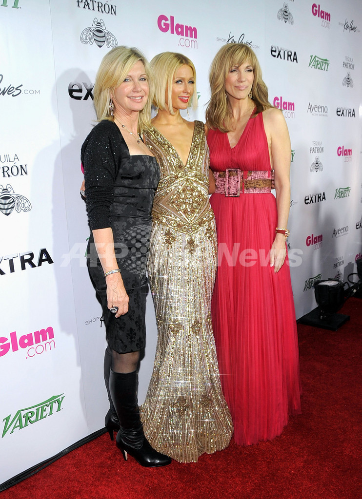 米カリフォルニア(California)州ビバリーヒルズ(Beverly Hills)で22日、慈善活動を推進するイベント「Night To Make a Difference」が開催され、多くの著名人が参加した。写真は来場したソーシャライトのパリス・ヒルトン(Paris Hilton、中)と、共同主催者のジャーナリスト、リーザ・ギボンズ(Leeza Gibbons、右)と歌手のオリヴィア・ニュートン・ジョン(Olivia Neton-John、2009年2月22日撮影)。(c)AFP/Getty Images/John M. Heller
