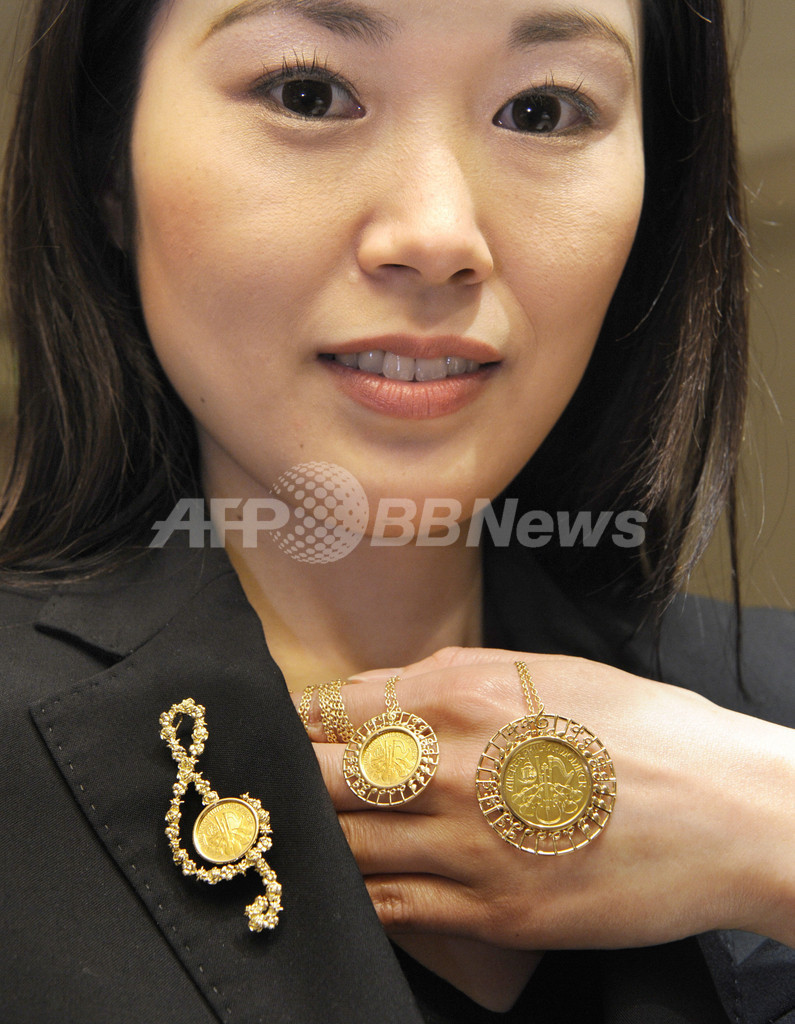 【2月25日 AFP】貴金属販売の田中貴金属ジュエリー(Tanaka Kikinzoku Jewelry)は24日、都内で、オーストリアの金貨で作られたペンダントとブローチを発表した。ペンダントには音符の飾りが散りばめられ、ブローチはト音記号をかたどっている。日本とオーストリアの修好140周年を記念して作られたもの。米国の景気対策法案施行後のインフレ懸念により、金価格は1オンス約1000ドル(約9万7000円)にまで急騰している。(c)AFP