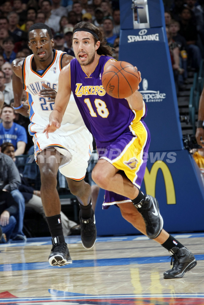 オクラホマシティ・サンダー戦でボールを運ぶロサンゼルス・レイカーズのサーシャ・ブヤチッチ(%%Sasha Vujacic%%)。試合はレイカーズが107-93でサンダーを下し、5連勝を飾った。(2009年2月24日撮影)(c)AFP/Getty Images/NBAE/Layne Murdoch