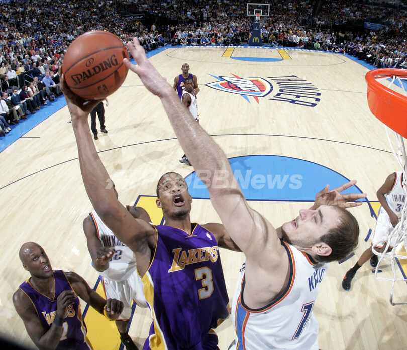 オクラホマシティ・サンダー戦でネナド・カースチッチ(%%Nenad Krstic%%)の上から得点を狙うロサンゼルス・レイカーズのトレバー・アリーザ(%%Trevor Ariza%%)。試合はレイカーズが107-93でサンダーを下し、5連勝を飾った。(2009年2月24日撮影)(c)AFP/Getty Images/NBAE/Layne Murdoch