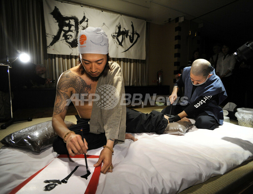 【2月26日 AFP】入れ墨師の彫妙(Horimyo)氏が25日、都内の日本外国特派員協会(Foreign Correspondents' Club of Japan、FCCJ)で制作のデモンストレーションを行った。(c)AFP