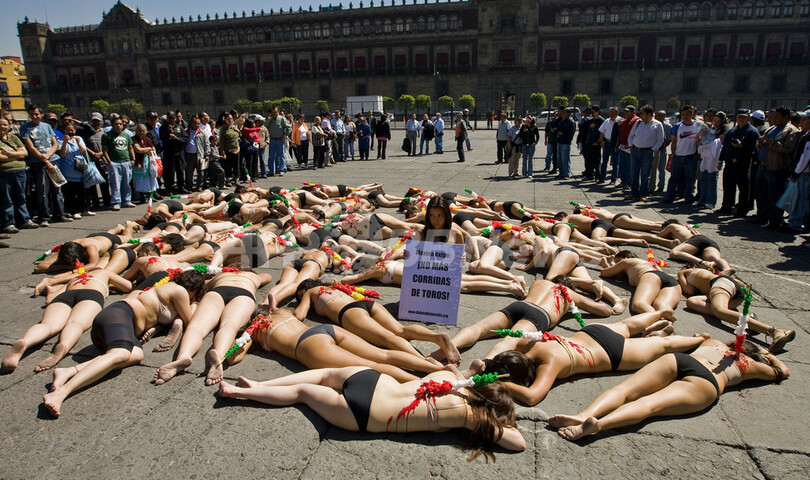 Zocalo Square)で、闘牛廃止を呼び掛けるデモ運動を行った。(c)AFP