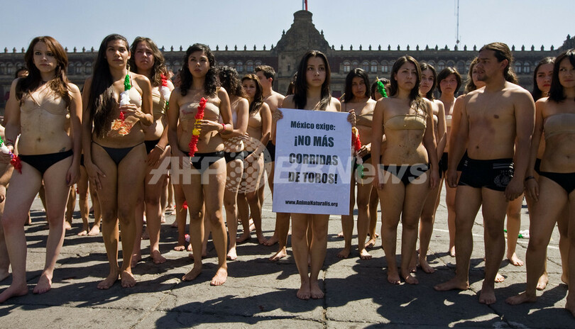 Zocalo Square)で、闘牛廃止を呼び掛けるデモ運動を行った。(c)AFP
