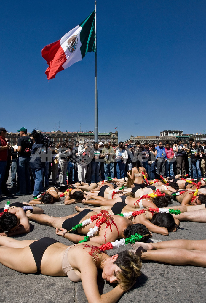 メキシコ市(Mexico City)のゾカロ広場(Zocalo Square)で、闘牛廃止を呼び掛けるデモ運動を行う動物保護団体AnimaNaturalisのメンバーら(2009年2月26日撮影)。(c)AFP