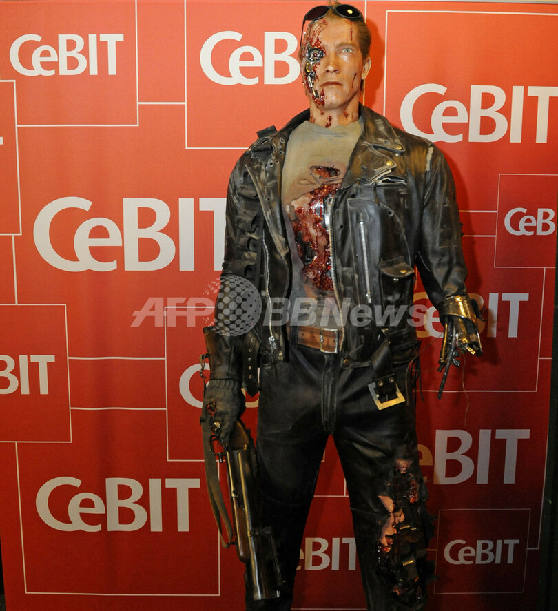 世界最大の情報技術見本市「CeBIT」が3日、ドイツ北部ハノーバー(Hannover)で開幕する。写真は今回の公式「パートナー州」になっている米カリフォルニア(California)州のアーノルド・シュワルツェネッガー(Arnold Schwarzenegger)知事が映画『ターミネーター(Terminator)』で演じたアンドロイドのフィギュア(2009年3月1日撮影)。(c)AFP/DDP/NIGEL TREBLIN