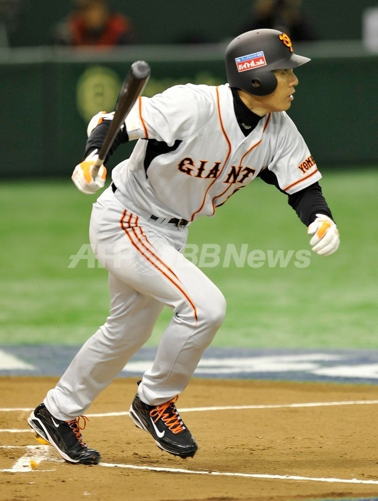 第2回ワールド・ベースボール・クラシック(%%2009 World Baseball Classic%%)強化試合、読売ジャイアンツ(%%Yomiuri Giants%%)対韓国。1回に2点適時二塁打を放つ読売ジャイアンツの李承ヨプ(%%Lee Seung-Youp%%、イ・スンヨプ)。試合は3-0で韓国が敗れた。(2009年3月3日撮影)(c)AFP/TORU YAMANAKA