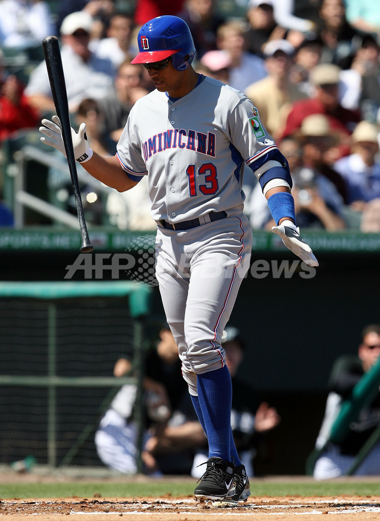 第2回ワールド・ベースボール・クラシック(%%2009 World Baseball Classic%%)強化試合、フロリダ・マーリンズ(%%Florida Marlins%%)対ドミニカ共和国。三振に倒れるドミニカ共和国のアレックス・ロドリゲス(%%Alex Rodriguez%%)。試合はドミニカ共和国が10-1でマーリンズに大勝した。(2009年3月3日撮影)(c)AFP/Getty Images/Doug Benc