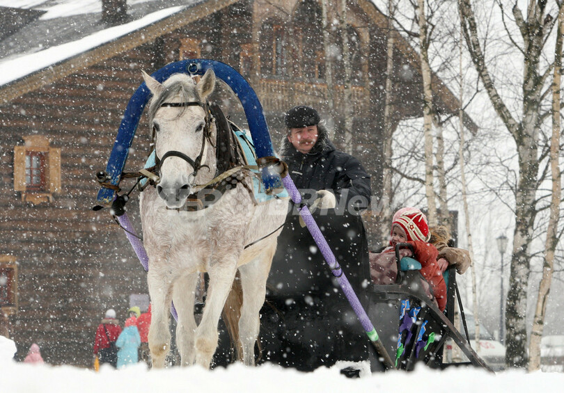 ロシア各地で前週末、冬に別れを告げるキリスト教の伝統行事、謝肉祭が行われた。謝肉祭はキリスト教の信者が4月の復活祭(イースター)に備えて準備を始める四旬節(Lent)の前、ざんげの節(Shrovetide)の期間に当たる。写真はサンクトペテルブルク(St. Petersburg)郊外のShuvalovka村で、そりに乗って謝肉祭に出かける家族(2009年2月28日撮影)。(c)AFP/KIRILL KUDRYAVTSEV
