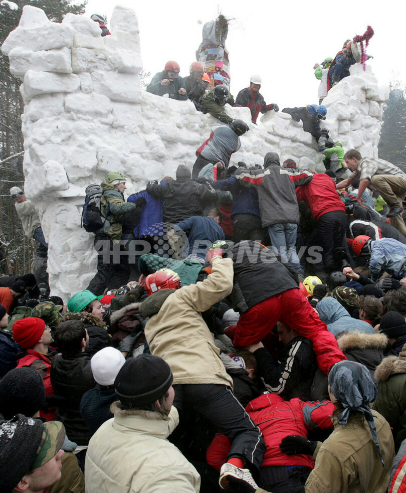 ロシア各地で前週末、冬に別れを告げるキリスト教の伝統行事、謝肉祭が行われた。謝肉祭はキリスト教の信者が4月の復活祭(イースター)に備えて準備を始める四旬節(Lent)の前、ざんげの節(Shrovetide)の期間に当たる。写真は1日、モスクワ郊外のDementevo村で行われた格闘の行事。ざんげの節の間は毎日に違う意味があり、わざと、あるいは知らずに人を傷つけてしまったことにゆるしを請う、告解の日曜として知られる「ざんげの日曜(Shrove Sunday)」が今年は1日だった。(2009年3月1日撮影)。(c)AFP/ARTYOM KOROTAYEV