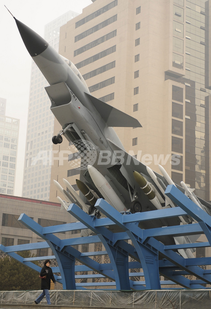 北京(Beijing)にある中国航空工業第一集団公司(China Aviation Industry Corporation I、AVIC I)本部の敷地内に置かれた、中国産戦闘機「J-10(殲十、Jian-10)」の縮尺模型(2009年3月4日撮影)。(c)AFP/Peter PARKS