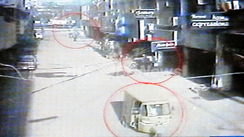 この映像は有線カメラで撮影されたもので、リュックサックを背負った襲撃犯2人が、何事もなかったかのように通りを徒歩でゆっくりと移動し、その後、バイクに乗って立ち去るというもの。