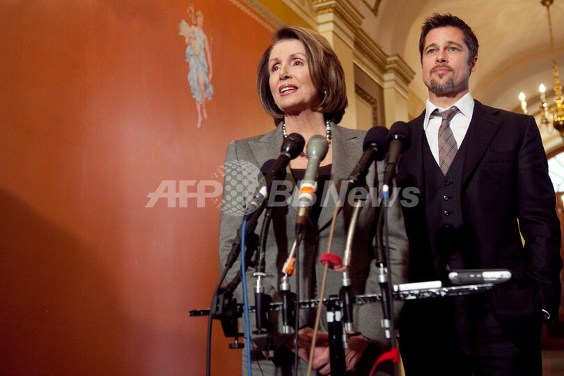 米俳優ブラッド・ピット(Brad Pitt)さんは5日、ハリケーン・カトリーナ(Hurricane Katrina)の被害にあったニューオーリンズ(New Orleans)を復興させようという計画「Make it Right」プロジェクトのため、ナンシー・ペロシ(Nancy Pelosi)下院議長、ジェームズ・クライバーン(James Clyburn)下院議員らとワシントンD.C.(Washington D.C.)で会談を行った。写真は、会談後に会見を行うブラッド・ピットさん(右)とペロシ氏(2009年3月5日撮影)。(c)AFP/Getty Images/Brendan Hoffman