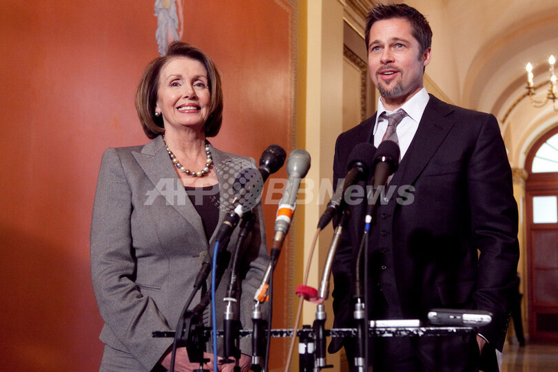 米俳優ブラッド・ピット(Brad Pitt)さんは5日、ハリケーン・カトリーナ(Hurricane Katrina)の被害にあったニューオーリンズ(New Orleans)を復興させようという計画「Make it Right」プロジェクトのため、ナンシー・ペロシ(Nancy Pelosi)下院議長、ジェームズ・クライバーン(James Clyburn)下院議員らとワシントンD.C.(Washington D.C.)で会談を行った。写真は、会談後に会見を行うブラッド・ピットさん(右)とペロシ氏(2009年3月5日撮影)。(c)AFP/Getty Images/Brendan Hoffman