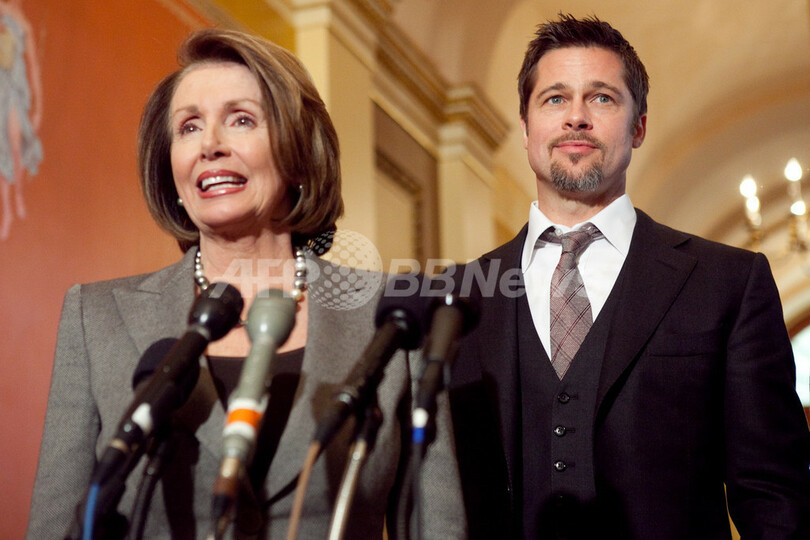 米俳優ブラッド・ピット(Brad Pitt)さんは5日、ハリケーン・カトリーナ(Hurricane Katrina)の被害にあったニューオーリンズ(New Orleans)を復興させようという計画「Make it Right」プロジェクトのため、ナンシー・ペロシ(Nancy Pelosi)下院議長、ジェームズ・クライバーン(James Clyburn)下院議員らとワシントンD.C.(Washington D.C.)で会談を行った。写真は、会談後に会見を行うブラッド・ピットさん(右)とペロシ氏(2009年3月5日撮影)。(c)AFP/Getty Images/Brendan Hoffman