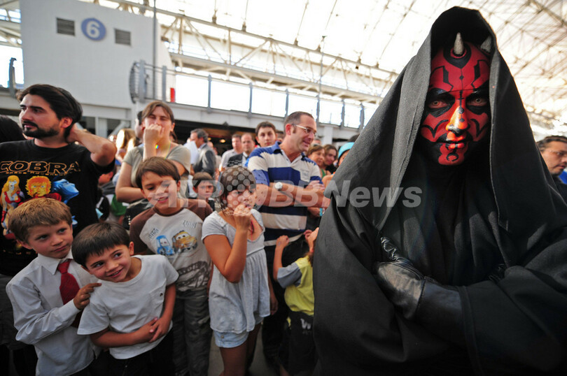 ジョージ・ルーカス(George Lucas)監督のSF超大作「スター・ウォーズ(Star Wars)」シリーズの展覧会「Star Wars The Exhibition Chile」が3月6日-5月31日、チリの首都サンティアゴ(Santiago)で行われている。登場キャラクターのアミダラ(Amidala)やレイア姫(Leah Princess)の衣装、実寸大の宇宙船のレプリカを含む約250のアイテム、全6作品のロケ地などが公開されている。写真は登場キャラクター、ダース・モール(Darth Maul)のコスプレをして来場したファン(右)と、それを見つめる子どもたち(2009年3月5日撮影)。(c)AFP/Martin BERNETTI