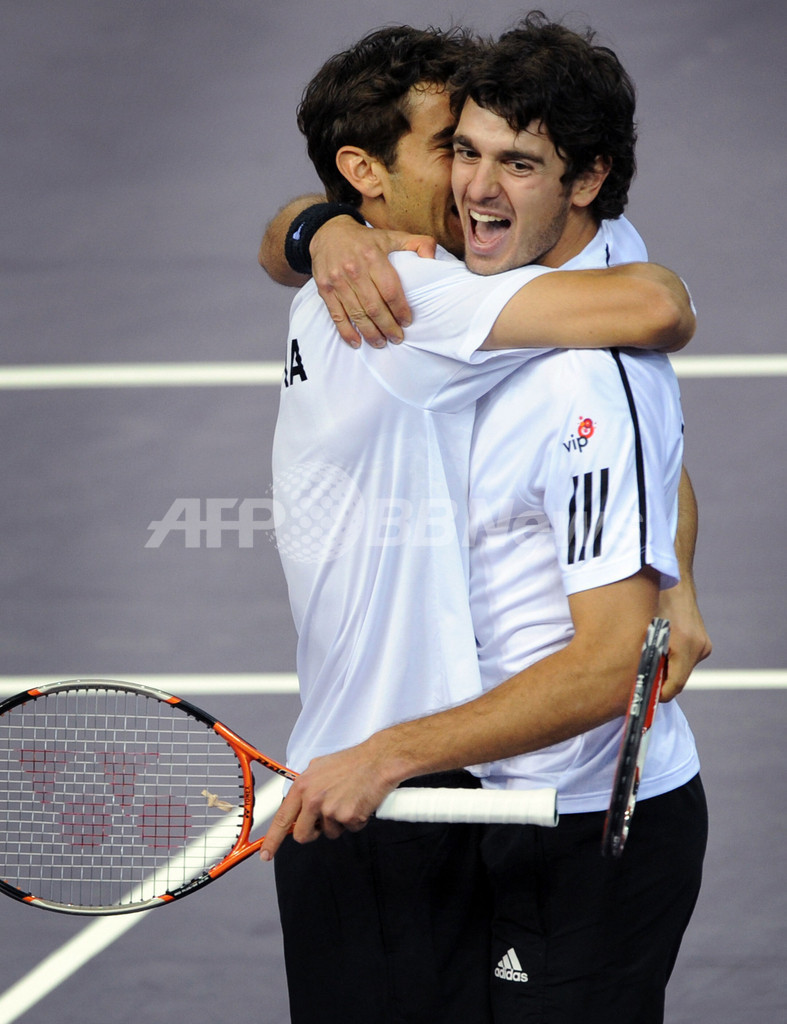 【3月8日 AFP】男子テニス国別対抗戦、デビスカップ(2009 Davis Cup)ワールドグループ1回戦、クロアチア対チリ。2日目はダブルスが行われ、クロアチアはマリオ・アンチッチ(Mario Ancic)/マリン・チリッチ(Marin Cilic)組が、チリのニコラス・マシュー(Nicolas Massu)/ポール・カプトヴィル(Paul Capdeville)組をセットカウント3-1(6-3、6-3、4-6、6-4)で下し、3連勝で準々決勝進出を決めた。(c)AFP