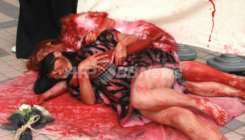 【3月8日 AFP】台湾の台北(Taipei)で8日、動物保護団体が毛皮反対を訴えて、全身に赤色のペンキを塗り「毛皮=死亡(Fur is Dead)」と書かれた横断幕を掲げる抗議デモを行った。