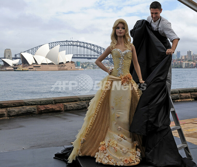 【3月9日 AFP】(写真追加)オーストラリアのシドニー(Sydney)で9日、米玩具メーカー、マテル(Mattel)の世界一有名な人形「バービー(Barbie)」の生誕50周年を記念して、全長2.1メートル、重量1200キロのバービー型ケーキが作られた。このケーキはバービー50周年記念限定モデルを元に作られ、ゴールドのアイシングとシルク、2000個のスワロフスキーを使って装飾されている。(c)AFP