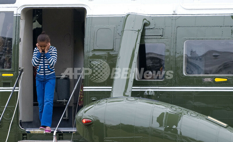 バラク・オバマ(Barack Obama)米大統領は8日、家族で滞在した米メリーランド(Maryland)州の米大統領山荘キャンプデービッド(Camp David)から、大統領専用ヘリ「マリーンワン(Marine One)」でホワイトハウス(White House)に戻った。写真はタラップを降りる次女サーシャ(Sasha Obama)さん(2009年3月8日撮影)。(c)AFP/Saul LOEB