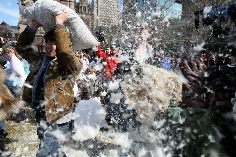 市当局の我慢が限界に達したのは前月。バレンタイン・デーに約1500-3000人が市中心部の広場とその周辺でピローファイトを行い、枕から飛び出した羽毛があたり一帯にひろがった。