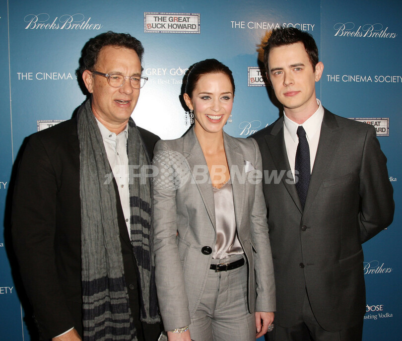 米ニューヨーク(New York)のトライベッカ・グランド・スクリーニング・ルーム(Tribeca Grand Screening Room)で映画『The Great Buck Howard』の上映会に出席した、出演俳優コリン・ハンクス(Colin Hanks、右)とその父で俳優のトム・ハンクス(Tom Hanks、左)、出演女優のエミリー・ブラント(Emily Blunt、2009年3月10日撮影)。(c)AFP/Getty Images/Stephen Lovekin