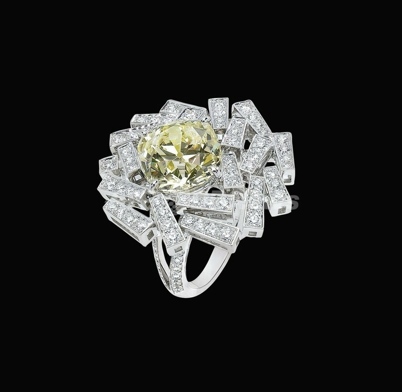 一つ一つの煌めく石には恋のショックを表現した。2つの石がデザインされたペアリングには偶然の出会いを表現。あえてオフセンターにセットされた大粒の貴石には、恋に乱れる心がバランスを保つ様子をおもわせる。