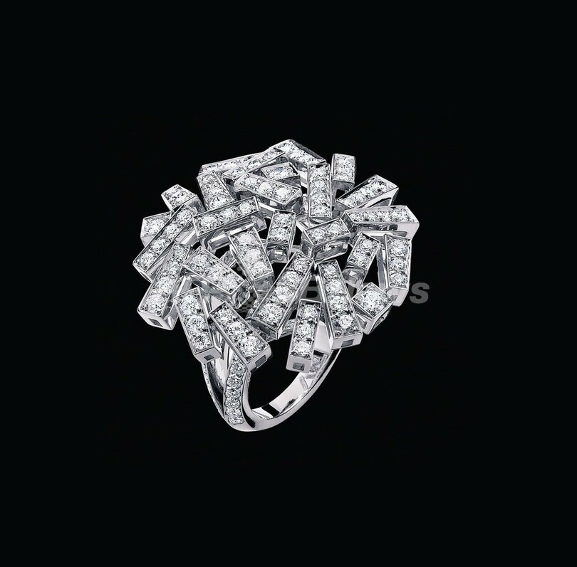 一つ一つの煌めく石には恋のショックを表現した。2つの石がデザインされたペアリングには偶然の出会いを表現。あえてオフセンターにセットされた大粒の貴石には、恋に乱れる心がバランスを保つ様子をおもわせる。