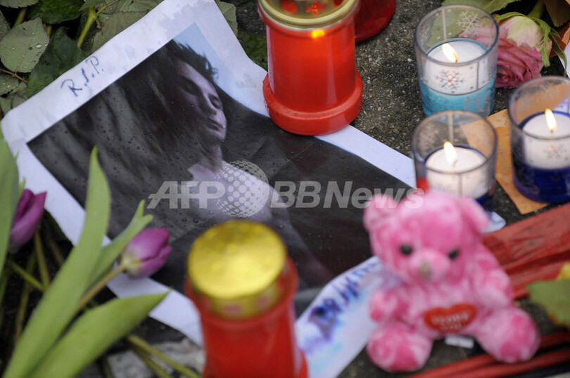 銃乱射事件のあったドイツ南部バーデン・ビュルテンベルク(Baden-Wuerttemberg)州シュツットガルト(Stuttgart)近郊ウィネンデン(Winnenden)にあるアルベルトビレ(Albertville)実科学校には、15人の犠牲者を悼み近隣住民ら多くの人が訪れている。同校では11日、黒色の戦闘服のようなものを着た元生徒の容疑者(17)が学校に侵入し、無差別に銃を乱射。15人が死亡した。写真は、事件のあった学校前に置かれた犠牲者の写真(2009年3月12日撮影)。(c)AFP/DDP/SASCHA SCHUERMANN