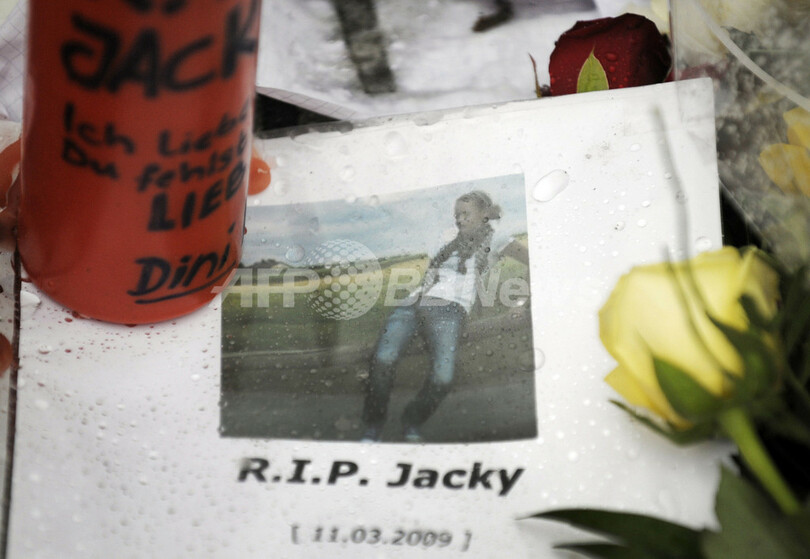 銃乱射事件のあったドイツ南部バーデン・ビュルテンベルク(Baden-Wuerttemberg)州シュツットガルト(Stuttgart)近郊ウィネンデン(Winnenden)にあるアルベルトビレ(Albertville)実科学校には、15人の犠牲者を悼み近隣住民ら多くの人が訪れている。同校では11日、黒色の戦闘服のようなものを着た元生徒の容疑者(17)が学校に侵入し、無差別に銃を乱射。15人が死亡した。写真は、事件のあった学校前に置かれた犠牲者の写真(2009年3月12日撮影)。(c)AFP/DDP/SASCHA SCHUERMANN