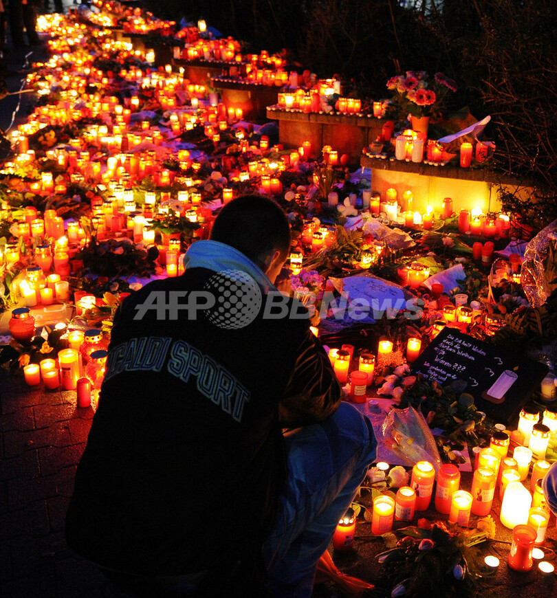 銃乱射事件のあったドイツ南部バーデン・ビュルテンベルク(Baden-Wuerttemberg)州シュツットガルト(Stuttgart)近郊ウィネンデン(Winnenden)にあるアルベルトビレ(Albertville)実科学校には、15人の犠牲者を悼み近隣住民ら多くの人が訪れている。同校では11日、黒色の戦闘服のようなものを着た元生徒の容疑者(17)が学校に侵入し、無差別に銃を乱射。15人が死亡した。写真は、一面のキャンドルと献花の前に座り込む訪問者(2009年3月12日撮影)。(c)AFP/DDP/TORSTEN SILZ