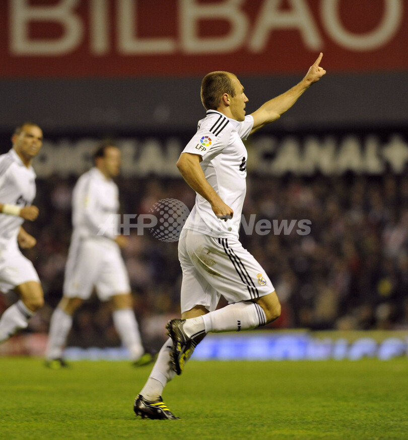 前半22分にアリエン・ロッベン(Arjen Robben)の得点で先制したレアル・マドリードは、同34分にガブリエル・エインセ(Gabriel Heinze)、後半2分と同15分にクラース・ヤン・フンテラール(Klaas-Jan Huntelaar)、同34分にはゴンサロ・イグアイン(Gonzalo Higuain)が追加点を挙げ、フランシスコ・ジェステ(Francisco Yeste)の退場により10人で戦ったアスレティック・ビルバオから勝利を収めた。(c)AFP/Phil Seery