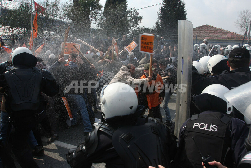 【3月17日 AFP】水資源問題に関する国際会議「第5回世界水フォーラム(World Water Forum)」が開催中のトルコ・イスタンブール(Istanbul)で16日、労働組合や環境活動家らがデモを行った。デモ隊は「水は人々のもの、生命そのもの。商品ではない」「われわれから水を奪う会議を粉砕せよ」などのスローガンを叫んで機動隊に投石。機動隊は催涙ガスを使用して約300人のデモ参加者を排除し、少なくとも15人を拘束した。3年ごとに開かれる「世界水フォーラム」は16日から22日までの一週間開催される。(c)AFP