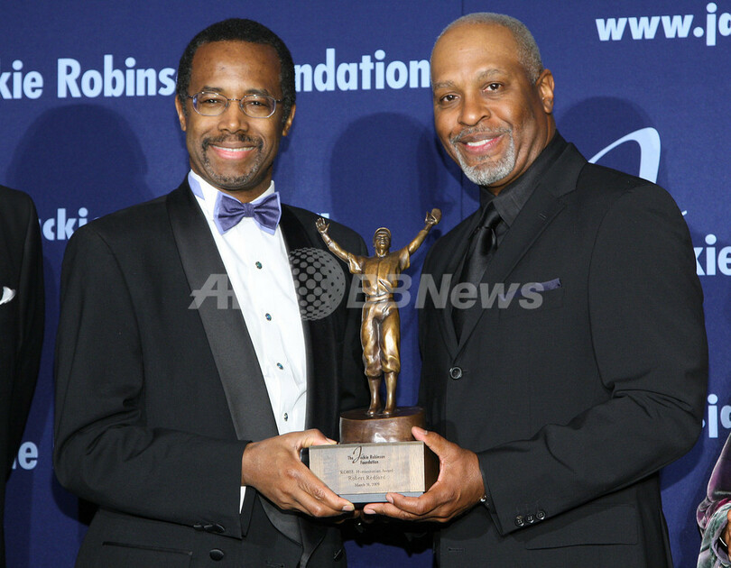 米ニューヨーク(New York)で16日、各界で人道的活動に貢献した人物に与えられる賞「ジャッキー・ロビンソン財団賞(Jackie Robinson Foundation Annual Awards)」の受賞式が行われた。写真は「ROBIE生涯功労賞(ROBIE Lifetime Achievement Award)」を受賞した、俳優ベンジャミン・カーソン・シニア(Benjamin Carson Sr.、左)と、プレゼンターを務めた俳優ジェームズ・ピッケンズ・Jr(James Pickens, Jr.、2009年3月16日撮影)。(c)AFP/Getty Images/Bryan Bedder