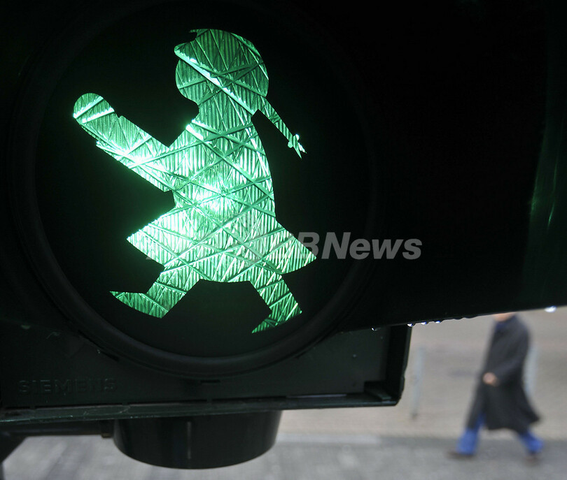 アンペルマンのマークは、ドイツで一度は忘れ去られようとしていたが、「アンペルメンヒェン救助委員会」(committee to save the little traffic light men)の活動で再び注目を集めた。現在では、旧東ドイツの歩行者用信号で使用されているだけでなく、マルク・ヘックハウゼン(Markus Heckhausen)氏の率いるデザインチームの手で、マグカップやTシャツ、コルク栓抜きなどのさまざまなキャラクター商品として人気を博している。(2009年3月13日撮影)。(c)AFP/DDP/HENNING KAISER