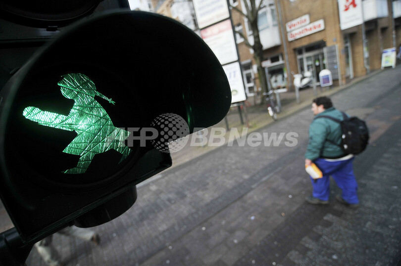 【3月17日 AFP】ドイツ西部ケルン(Cologne)で使用されている歩行者用信号の人型マーク「アンペルメンヒェン」(アンペルマン、ampelmaennchen)の少女版「Ampelmaedchen」(アンペルフロイ、Ampelfrau)。(c)AFP